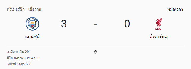 • นาทีที่ 94: 🔔 หมดเวลา! แมนเชสเตอร์ ซิตี้ เอาชนะ ลิเวอร์พูล 3–0