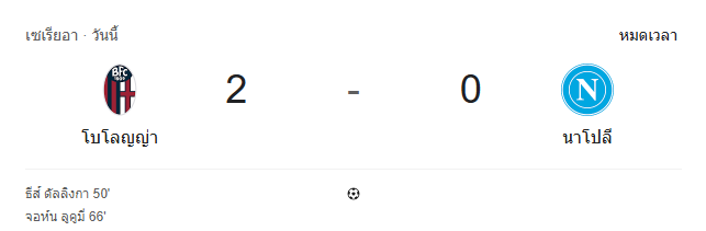 - นาทีที่ 95: 🔔 หมดเวลา! โบโลญญ่า เอาชนะ นาโปลี 2–0!