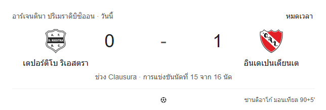 - หมดเวลา: เดปอร์ตีโบ รีเอสตรา 0 – 1 อินเดเปนเดียนเต อินเดเปนเดียนเตเฉียบขาดกว่าในช่วงท้ายเกม คว้า 3 แต้มสำคัญออกจากบ้านได้สำเร็จ