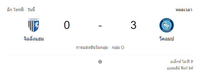 • หมดเวลา: จิลลิ่งแฮม 0 – 3 วีคอมบ์ วันเดอเรอร์ส