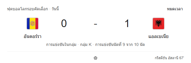 ผลบอลสด ฟุตบอลโลก รอบคัดเลือก โซนยุโรป ระหว่าง อันดอร์รา 0-1 แอลเบเนีย วันนี้ 14/11/68