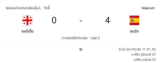 ทัพกระทิงดุโชว์ฟอร์มเฉียบขาดทุกมิติ ทั้งจังหวะครองบอล การเข้าทำ และบทบาทของตัวรุกอย่าง โอยาร์ซาบัล – ตอร์เรส – ซูบิม็องดี้ ที่เล่นกันอย่างลื่นไหล ส่วนจอร์เจียแม้จะพยายามสู้เต็มที่ แต่คุณภาพเกมรุกยังไม่พอจะเจาะผู้มาเยือน สเปนเก็บ 15 คะแนนเต็มจาก 5 นัด ยึดจ่าฝูงกลุ่ม E แบบไร้คู่แข่ง ส่วนจอร์เจียยังนิ่งอยู่กลางตาราง