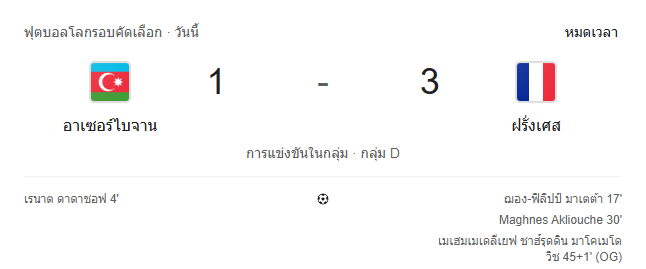 • นาทีที่ 45: OG! อาเซอร์ไบจานทำเข้าประตูตัวเองจาก Sahruddin Mahammadaliyev ฝรั่งเศสนำ 1-3