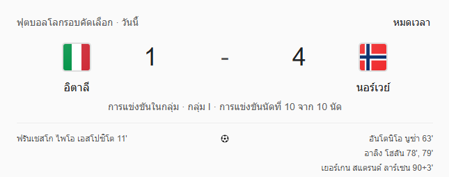 • หมดเวลา: อิตาลี 1-4 นอร์เวย์ นอร์เวย์คมกว่าอย่างชัดเจน พลิกนรกจากตามหลังกลับมาถล่มคว้าชัยใหญ่ได้สำเร็จ