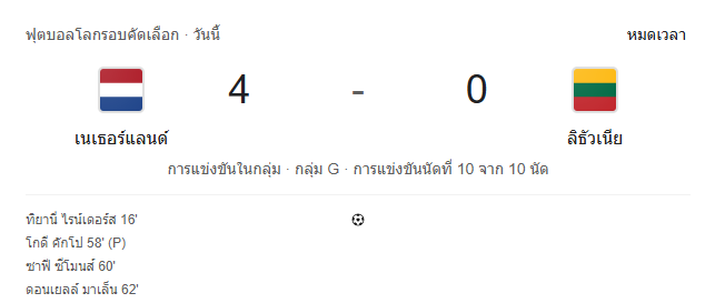 - หมดเวลา: เนเธอร์แลนด์ 4-0 ลิทัวเนีย