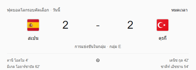 ในการแข่งขันฟุตบอลโลก 2026 รอบคัดเลือก โซนยุโรป กลุ่ม E ค่ำคืนสุดเดือดนี้ บ้านกีฬา ขอพาแฟนบอลอัปเดต ผลบอลสด คู่บิ๊กแมตช์ที่แฟนทั้งโลกจับตา เมื่อ สเปน เปิดรัง Estadio de La Cartuja ทำศึกกับ ตุรกี และผลจบลงแบบสุดระทึกด้วยสกอร์ 2-2 เกมที่เต็มไปด้วยจังหวะพลิกไปมา ดุดันทุกองศา และใครพลาดแม้แต่วินาทีเดียวคือเสียดายสุด ๆ