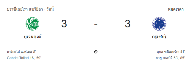 ผลบอลสด กังเปโอนาตู บราซีเลย์รู แซรียีอา ระหว่าง ยูเวนตูเด้ 3-3 ครูไซโร่ (เอ็มจี) วันนี้ 21/11/68