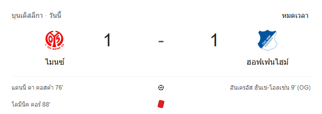 • นาทีที่ 99: จบเกม ไมนซ์ 05 เสมอ ฮอฟเฟนไฮม์ 1-1