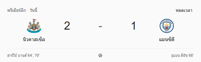- นาทีที่ 99 — จบเกม! ซิตี้บุกหนักแต่ไม่ผ่านกำแพงของ Nick Pope และเกมรับนิวคาสเซิล สุดท้าย นิวคาสเซิล ยูไนเต็ด เปิดบ้านชนะ แมนเชสเตอร์ ซิตี้ 2-1