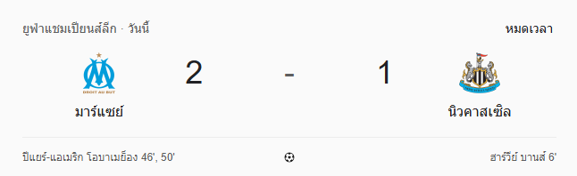 เสียงนกหวีดสุดท้ายดังขึ้น มาร์กเซยสร้างคัมแบ็กโหดเฉือนนิวคาสเซิ่ล 2-1 เก็บชัยสำคัญในศึกยุโรป ส่วนสาลิกาดงแม้จะเริ่มเกมได้ดีแต่กลับโดนความเฉียบคมของโอบาเมย็องลงโทษเต็ม ๆ ผลงานของ โอบาเมย็อง ในเกมนี้เรียกว่า “โหดชิงพื้นที่ข่าวหน้าแรก” ยิงทั้งสองประตู และเป็น Man of the Match แบบไร้ข้อกังขา