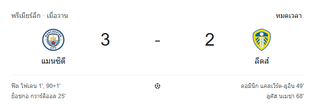- จบเกม: แมนเชสเตอร์ ซิตี้ 3–2 ลีดส์ ยูไนเต็ด เกมมันส์สุดเดือด ซิตี้เฉือนชัยในช่วงทดเวลา หลังลีดส์ไล่ตีเสมอแบบสุดเหลือเชื่อ