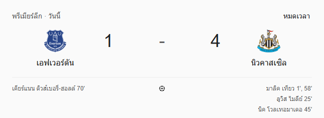 • หมดเวลา: เอฟเวอร์ตัน 1–4 นิวคาสเซิล ยูไนเต็ด