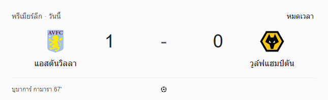 - จบเกม: แอสตันวิลลา 1-0 วูล์ฟแฮมป์ตัน