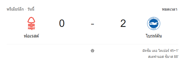 ลูกทีมของ ฟาเบียน เฮอช์เซลอร์ เล่นด้วยความแน่นอนกว่า ส่วนฟอเรสต์ของ ฌอน ไดช์ แม้จะมีโอกาสเพียบ แต่ขาดความเฉียบคม ผลงานวันนี้บอกชัดว่าเกมรุกต้องเร่งแก้ด่วน ไม่อย่างนั้นเสี่ยงร่วงไปกองท้ายตารางยาว แมตช์นี้สรุปสั้น ๆ ไบรท์ตันเฉียบ ฟอเรสต์จืดจาง และผล 2-0 สะท้อนทุกอย่างได้คมกริบ