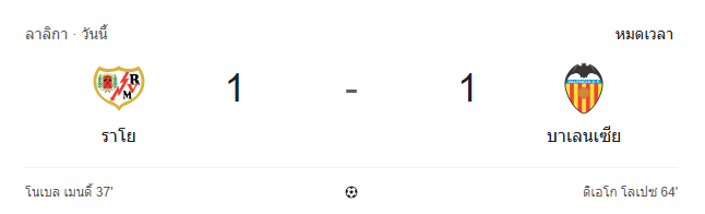 ราโย บาเยกาโน่ 1-1 บาเลนเซีย ราโย่ บาเยกาโน่ ยังคงรั้งอันดับ 9 ของตาราง มี 17 คะแนน ทำผลงานได้เหนียวแน่นในบ้าน บาเลนเซีย เก็บเพิ่มหนึ่งแต้ม ขยับอยู่ในอันดับ 15 มี 14 คะแนน สถานการณ์ยังไม่นิ่งแต่เห็นพัฒนาการชัดเจน เกมนี้ตัวเด่นต้องยกให้ โนเบล เมนดี้ ที่กดหนึ่งประตูและป่วนเกมรับบาเลนเซียจนปั่นป่วน ส่วนฝั่งทีมเยือน ดีเอโก้ โลเปซ แบกทีมสุดกำลัง ยิงตีเสมอและเป็นอันตรายในแดนหน้าแทบทุกครั้งที่ได้บอล