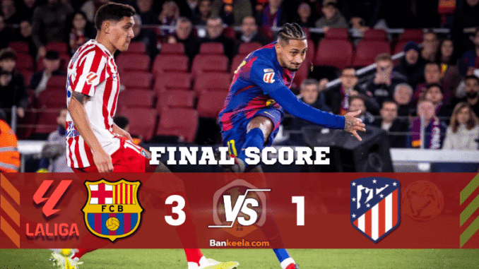 ศึกใหญ่ลาลีกาคืนนี้ บาร์เซโลน่า เปิดสปอติฟาย คัมป์ นู ระเบิดฟอร์มโหด ไล่ถล่ม แอตเลติโก้ มาดริด 3-1 ในเกมที่รูปเกมเดือดตั้งแต่นาทีแรก จนสาวกที่ตามลุ้น ผลบอลสด แทบไม่กะพริบตา ประตูของเจ้าบุญทุ่มมาจาก ราฟินญ่า นาที 26, ดานี่ โอลโม่ นาที 65 และ เฟร์ราน ตอร์เรส นาที 90+7 ส่วนทีมเยือนนำก่อนจาก อเล็กซ์ บาเอน่า นาที 19