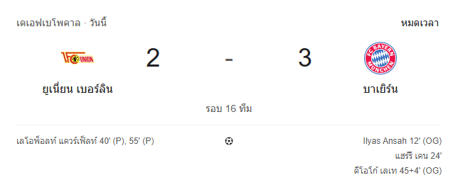 ศึก เดเอฟเบ โพคาล รอบ 16 ทีมเมื่อคืนนี้เต็มไปด้วยความดุเดือดดั่งไฟลุก เมื่อ ยูเนี่ยน เบอร์ลิน เปิดบ้านรับการมาเยือนของ บาเยิร์น มิวนิค ก่อนจบเกมด้วยสกอร์ 2-3 ในเกมที่ทั้งสองฝ่ายเปิดหน้าแลกใส่กันไม่ยั้ง ตั้งแต่นาทีแรกจนวินาทีสุดท้าย และแน่นอน บ้านกีฬา ขอนำเสนอพร้อมแทรกอัปเดตแบบฉับไวจาก ผลบอลสด ที่เรานำข้อมูลการแข่งขันมาเสิร์ฟให้ครบทุกช็อตสำคัญ