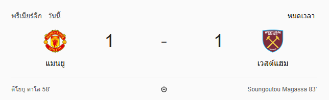 - หมดเวลา: แมนเชสเตอร์ ยูไนเต็ด 1-1 เวสต์แฮม ยูไนเต็ด เกมเปิดแลกสนุก มีโอกาสกันตลอด ฝั่งเจ้าถิ่นน่าจะปิดเกมได้ก่อน แต่เวสต์แฮมไม่ยอมแพ้จนตามตีเสมอสำเร็จในช่วงท้ายเกม