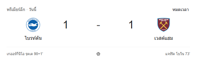 - หมดเวลา: จบเกม ไบรท์ตันไล่ตีเสมอเวสต์แฮม 1-1 แบบสุดมันส์