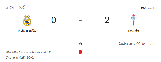 - หมดเวลา: เรอัลมาดริด 0-2 เซลต้า บีโก้ — ทีมเยือนชิงโอกาสยิงคมกว่า เก็บสามแต้มไปอย่างเด็ดขาด