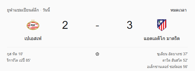 - หมดเวลา: พีเอสวี 2-3 แอตเลติโก มาดริด