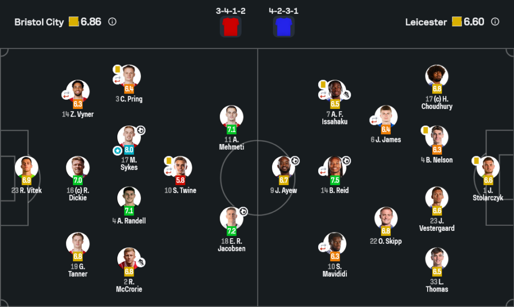 บริสตอล ซิตี้ ใช้ระบบ 3-4-1-2 ที่เน้นครองบอลจากแนวรับขึ้นกลาง แล้วค่อยกระจายไปสองฝั่งให้วิงแบ็กเติมสูง จุดแข็งคือเมื่อเข้าสู่จังหวะบุก พวกเขากลายร่างเป็น 3-2-5 มีตัวรุกห้าแนวหน้าไล่กดดันแนวรับเลสเตอร์ตลอด โดยเฉพาะฝั่งซ้ายหลังพักครึ่งที่มี เนโต บอร์เกส เติมคู่กับ เมห์เมตี ทำให้เลสเตอร์ต้องถอยลงไปยืนลึก เกมรุกของเจ้าบ้านจึงคมและต่อเนื่องจนได้สองประตู