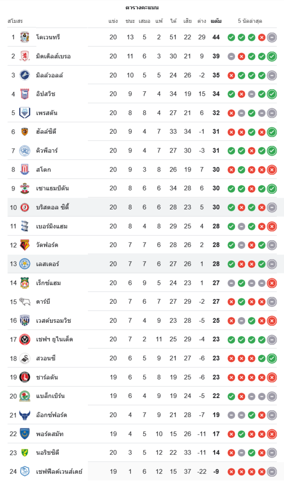 ฝั่ง เลสเตอร์ ซิตี้ ลงเตะ 20 นัด เก็บได้ 28 คะแนน จาก ชนะ 7 เสมอ 7 แพ้ 6 ยิง 27 เสีย 26 ประตู เกมนี้ถ้าเก็บสามแต้มได้จะทะยานขึ้นไปเบียดโซนบนทันที แต่การปล่อยให้โดนตีเสมอทำให้ยังวนเวียนอยู่แถวอันดับ 13 ต้องลุ้นหนักในช่วงบ็อกซิ่งเดย์ว่าจะรักษาระยะห่างจากโซนตกชั้นและไล่จี้กลุ่มลุ้นเพลย์ออฟได้แค่ไหน