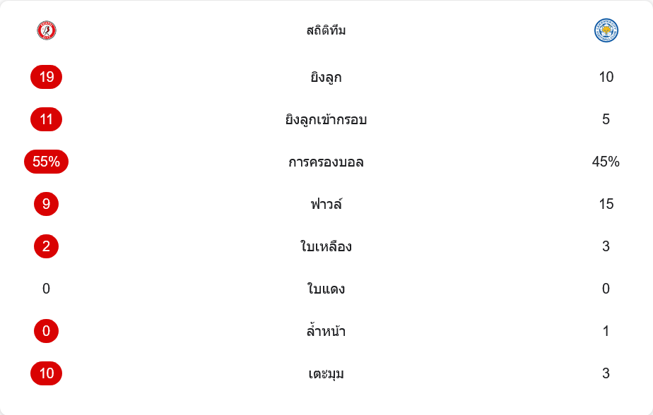 🕰️ ครึ่งแรก – เลสเตอร์บุกน้อยแต่คม นำห่าง 2-0