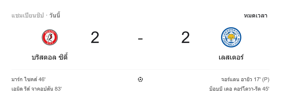 ช่วงท้ายเกมทั้งสองทีมเปิดหน้าแลก มีใบเหลืองปลิวหลายใบ แต่ไม่มีประตูเพิ่ม จบเกมแบบสุดมันส์ บริสตอล ซิตี้ แบ่งแต้มจาก เลสเตอร์ ซิตี้ ได้สำเร็จ ส่งผลให้หน้าเว็บ บ้านผลบอล วันนี้มีอีกหนึ่งคู่ที่แฟนบอลต้องย้อนดูไฮไลต์กันยาวๆ