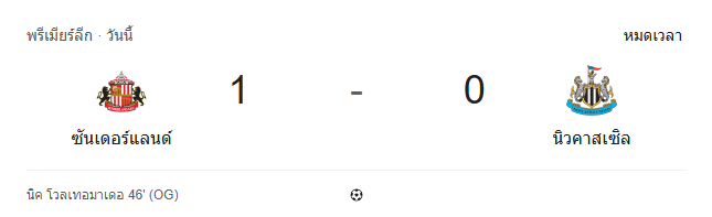 - นาทีที่ 98: หมดเวลา ซันเดอร์แลนด์เปิดบ้านเฉือนชนะ นิวคาสเซิล ยูไนเต็ด 1-0