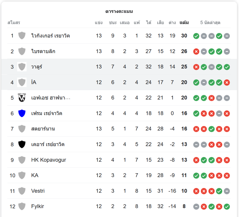 สำหรับสถานการณ์ในตารางคะแนนหลังจบเกมนี้ อัคราเนส ขยับขึ้นมาอยู่ที่อันดับ 4 มี 20 คะแนนจาก 12 นัด ส่วน วาลูร์ เรย์ยาวิค ยังคงอยู่ที่อันดับ 3 มี 25 คะแนนจาก 13 นัด