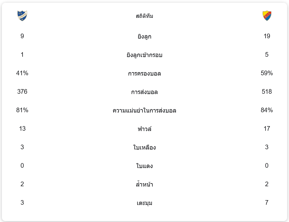 - การครองบอล: นอร์โคปิ้ง 41%, เยอร์การ์เด้นส์ 59%