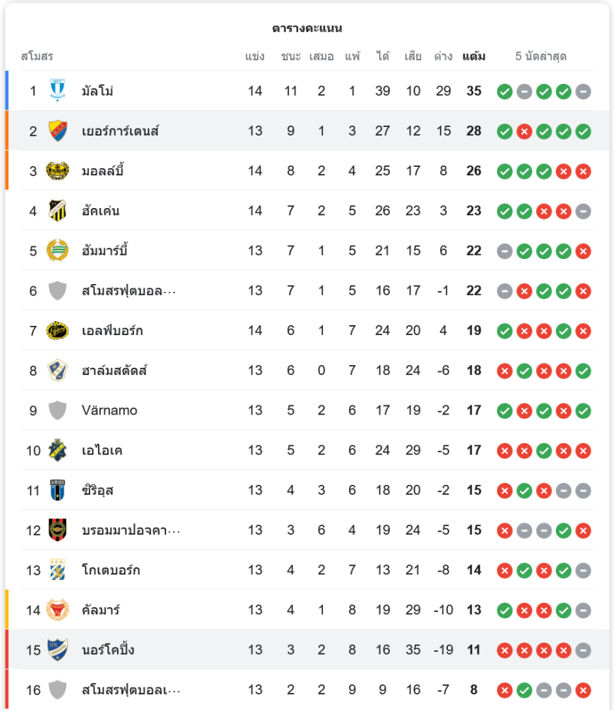 ผลการแข่งขันนี้ทำให้ เยอร์การ์เด้นส์ ขยับขึ้นไปอยู่อันดับที่ 2 ของตารางคะแนน มี 28 คะแนนจากการลงเล่น 13 นัด ขณะที่ นอร์โคปิ้ง ยังคงอยู่ในอันดับที่ 15 มีเพียง 11 คะแนนจากการลงเล่น 13 นัด