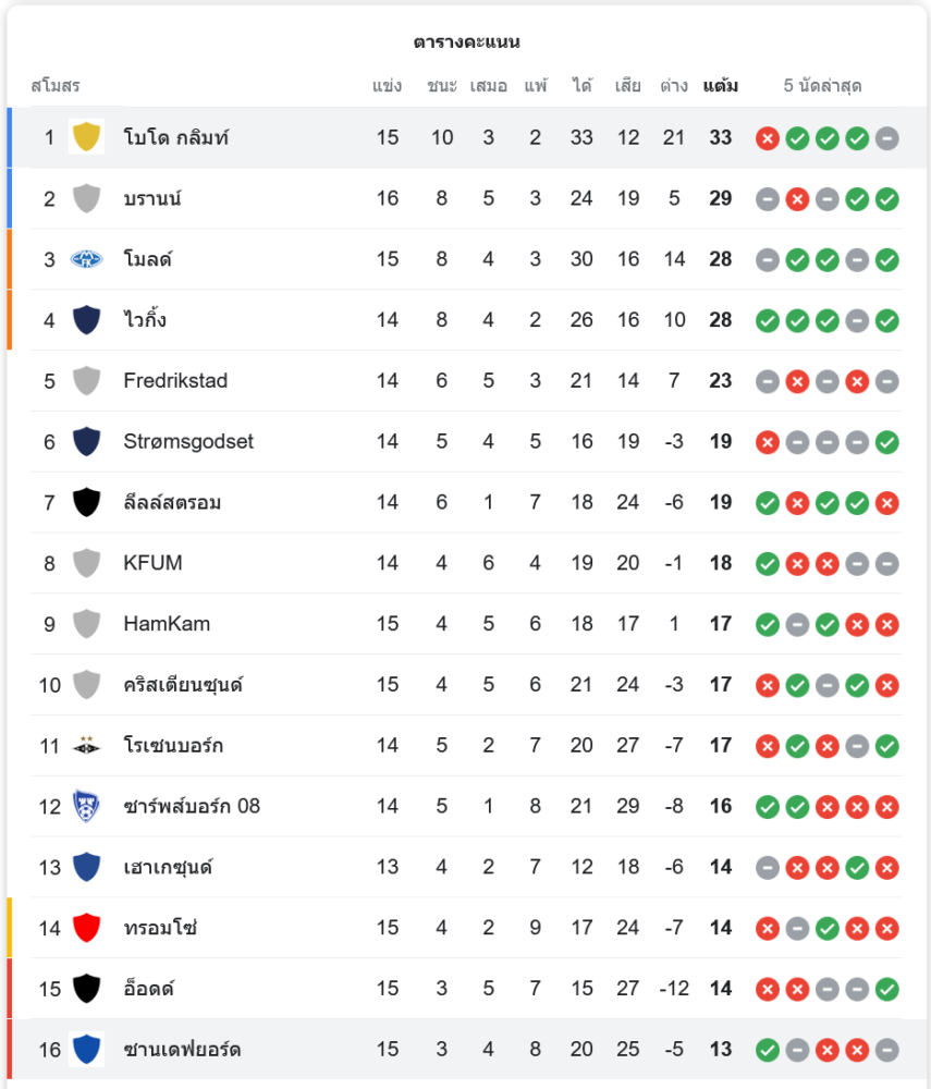 - Fredrikstad: แข่ง 14 นัด ชนะ 6 นัด เสมอ 3 นัด แพ้ 5 นัด (21 คะแนน)