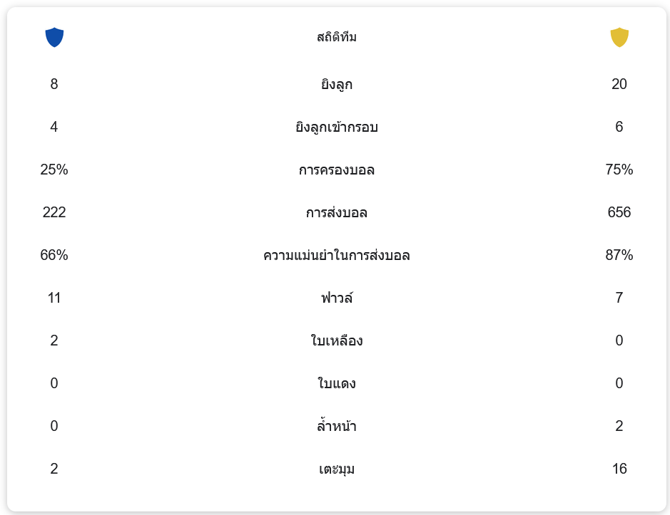 ซานเดฟยอร์ด ครองบอลเพียง 25% ยิงประตูทั้งหมด 8 ครั้ง โดยเข้ากรอบ 4 ครั้ง พวกเขาส่งบอลทั้งหมด 222 ครั้ง ด้วยความแม่นยำในการส่งบอลอยู่ที่ 66% ซานเดฟยอร์ด ทำฟาวล์ทั้งหมด 11 ครั้ง ได้รับใบเหลือง 2 ใบ ไม่มีใบแดง ลูกล้ำหน้า 0 ครั้ง และได้ลูกเตะมุม 2 ครั้ง