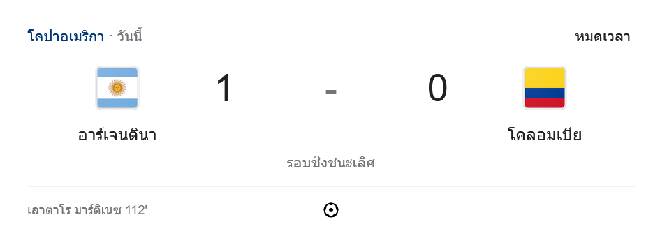 แม้ ลิโอเนล เมสซี่ จะบาดเจ็บ แต่ทัพ อาร์เจนติน่า ก็รวมใจฝ่าฟัน โคลอมเบีย ในช่วงต่อเวลา ด้วยทีเด็ดของ เลาตาโร่ มาร์ติเนซ ที่ลงมาเป็นฮีโร่ พาทีมป้องกันแชมป์ โกปา อเมริกา ที่สหรัฐฯ ได้สำเร็จ