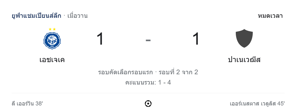 ผลการแข่งขันสิ้นสุดที่เอชเจเค เฮลซิงกิ 1-1 บอลติกปาเนเวจิส ส่งผลให้บอลติกปาเนเวจิสผ่านเข้ารอบต่อไปด้วยคะแนนรวม 4-1