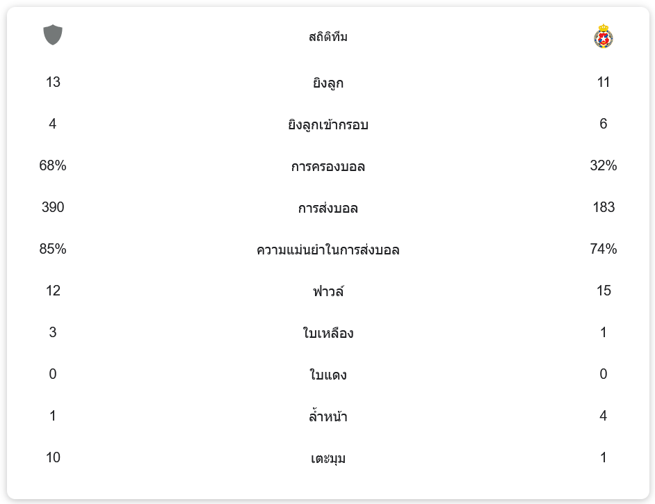 วิสล่า คราคอฟมีสถิติในเกมนี้ดังนี้: ยิงลูกทั้งหมด 11 ครั้ง ยิงลูกเข้ากรอบ 6 ครั้ง ครองบอลได้ 32% การส่งบอลทั้งหมด 183 ครั้ง โดยมีความแม่นยำในการส่งบอล 74% ทำฟาวล์ 15 ครั้ง ได้รับใบเหลือง 1 ใบ ไม่มีใบแดง ล้ำหน้า 4 ครั้ง และได้เตะมุม 1 ครั้ง