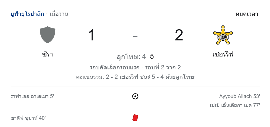 การแข่งขันยูฟ่ายูโรปาลีก รอบคัดเลือกรอบแรก รอบที่ 2 จาก 2 นัด ซีร่า เอฟเค พบกับ เชอริฟฟ์ จบลงด้วยสกอร์ 1-2 ทำให้เชอริฟฟ์ผ่านเข้ารอบด้วยคะแนนรวม 5-4 จากการยิงลูกโทษ