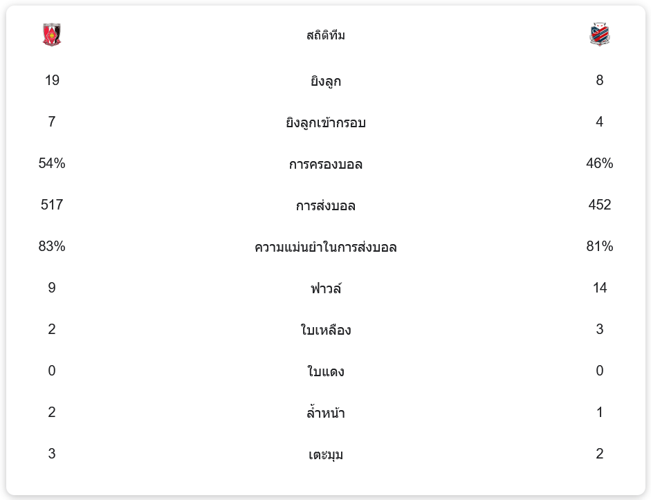 ในเกมนี้ อูราวะ เรด ไดมอนส์ มีการยิงลูกทั้งหมด 19 ครั้ง โดย 7 ครั้งตรงกรอบ ขณะที่คอนซาโดล ซัปโปโร ยิงลูกทั้งหมด 8 ครั้ง ตรงกรอบ 4 ครั้ง อูราวะ เรด ไดมอนส์ มีการครองบอล 54% และการส่งบอลทั้งหมด 517 ครั้ง ซึ่งมีความแม่นยำในการส่งบอลถึง 83% ขณะที่คอนซาโดล ซัปโปโร ครองบอล 46% มีการส่งบอลทั้งหมด 452 ครั้ง และความแม่นยำในการส่งบอลอยู่ที่ 81%