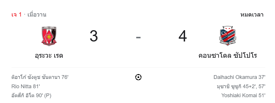 ผลบอลเจลีก ดิวิชัน 1 2024 อูราวะ เรด ไดมอนส์ 3-4 คอนซาโดล ซัปโปโร วันนี้ 21/7/67