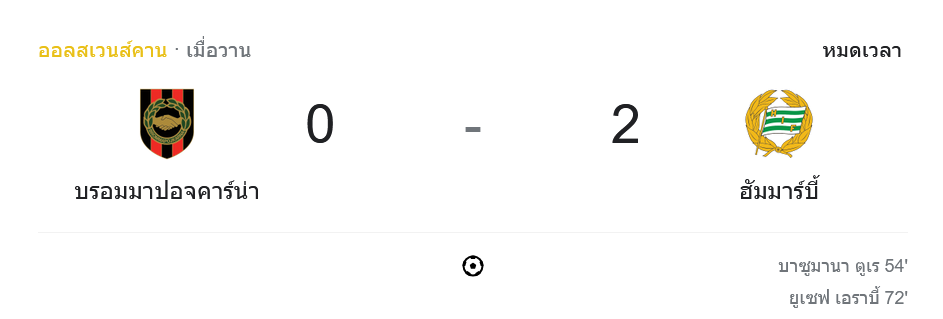 ผลบอลออลสเวนส์คาน 2024 บรอมมาปอจคาร์น่า 0-2 ฮัมมาร์บี้ วันนี้ 21/7/67