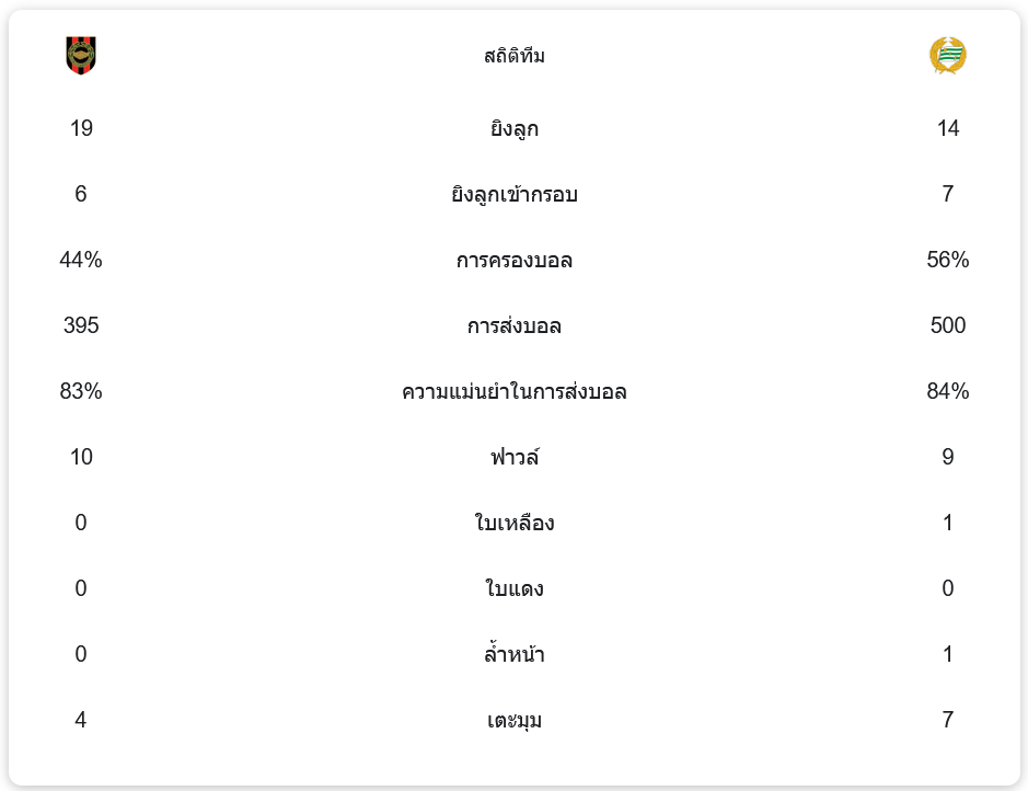 ในเกมนี้ บรอมมาปอจคาร์น่า มีการยิงลูกทั้งหมด 19 ครั้ง โดย 6 ครั้งตรงกรอบ ขณะที่ฮัมมาร์บี้ยิ่งลูกทั้งหมด 14 ครั้ง ตรงกรอบ 7 ครั้ง ฮัมมาร์บี้มีการครองบอลถึง 56% และการส่งบอลทั้งหมด 500 ครั้ง ซึ่งมีความแม่นยำในการส่งบอลถึง 84% ขณะที่บรอมมาปอจคาร์น่าครองบอล 44% มีการส่งบอลทั้งหมด 395 ครั้ง และความแม่นยำในการส่งบอลอยู่ที่ 83%