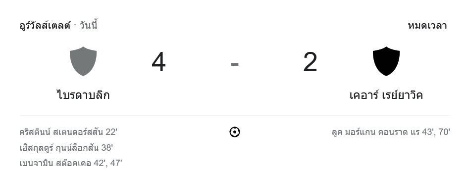 การแข่งขันฟุตบอลพรีเมียร์ลีก ไอซ์แลนด์ 2024 ระหว่าง เบรย์ดาบลิค กับ เคอาร์ เรย์ยาวิค จบลงด้วยชัยชนะของเบรย์ดาบลิค 4-2 ที่สนามของเบรย์ดาบลิคเมื่อวานนี้