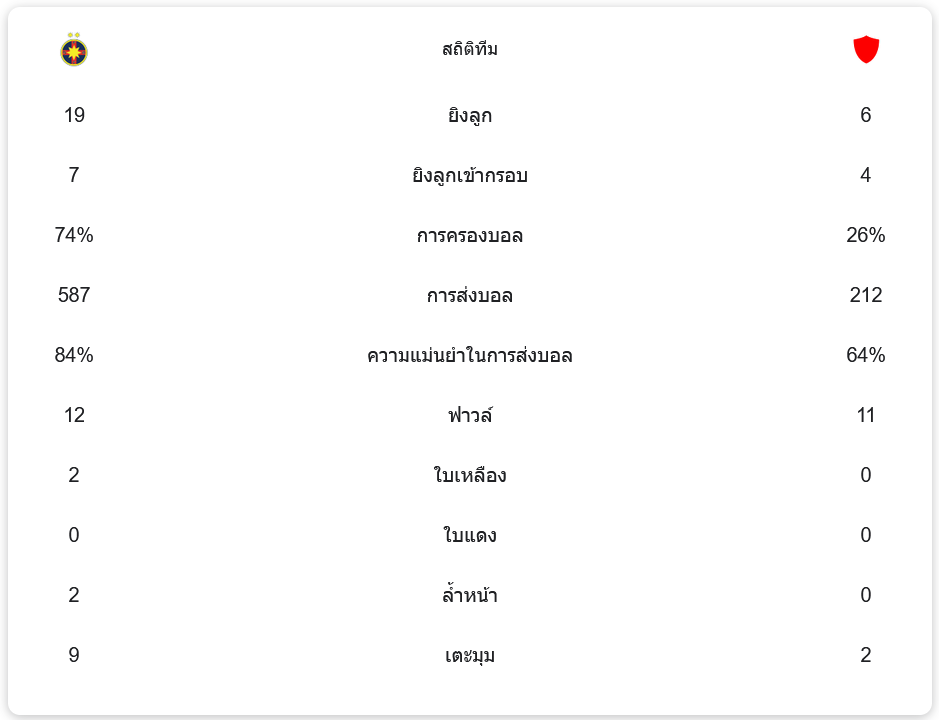 • สเตอัว บูคาเรสต์ มีการยิงทั้งหมด 19 ครั้ง เข้ากรอบ 7 ครั้ง และมีการครองบอล 74%