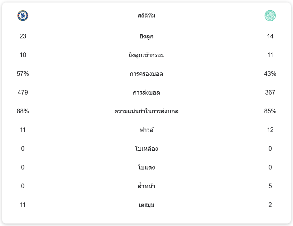 - ความแม่นยำในการส่งบอล: เชลซี 88% – 85% เซลติก