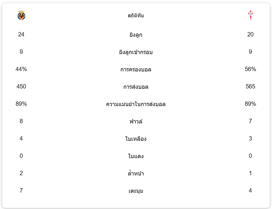 แม้ว่าบียาร์เรอัลจะมีอัตราครองบอลน้อยกว่าเซลต้า บีโก้ โดยทีมเจ้าบ้านครองบอลได้เพียง 44% ขณะที่เซลต้าครองบอลได้ 56% แต่บียาร์เรอัลมีความแม่นยำในการส่งบอลสูงถึง 89% จากการส่งบอลทั้งหมด 450 ครั้ง เท่ากับเซลต้าที่มีความแม่นยำ 89% เช่นกันจากการส่งบอล 565 ครั้ง บียาร์เรอัลมีโอกาสยิงทั้งหมด 24 ครั้ง โดยเข้ากรอบ 9 ครั้ง ในขณะที่เซลต้ามีโอกาสยิง 20 ครั้ง และเข้ากรอบ 9 ครั้ง การแข่งขันนี้มีการทำฟาวล์เกิดขึ้นรวมกันทั้งหมด 15 ครั้ง โดยบียาร์เรอัลทำฟาวล์ 8 ครั้ง และเซลต้าทำฟาวล์ 7 ครั้ง นอกจากนี้ยังมีการแจกใบเหลืองรวมกันทั้งหมด 7 ใบ โดยบียาร์เรอัลได้รับ 4 ใบ และเซลต้าได้รับ 3 ใบ