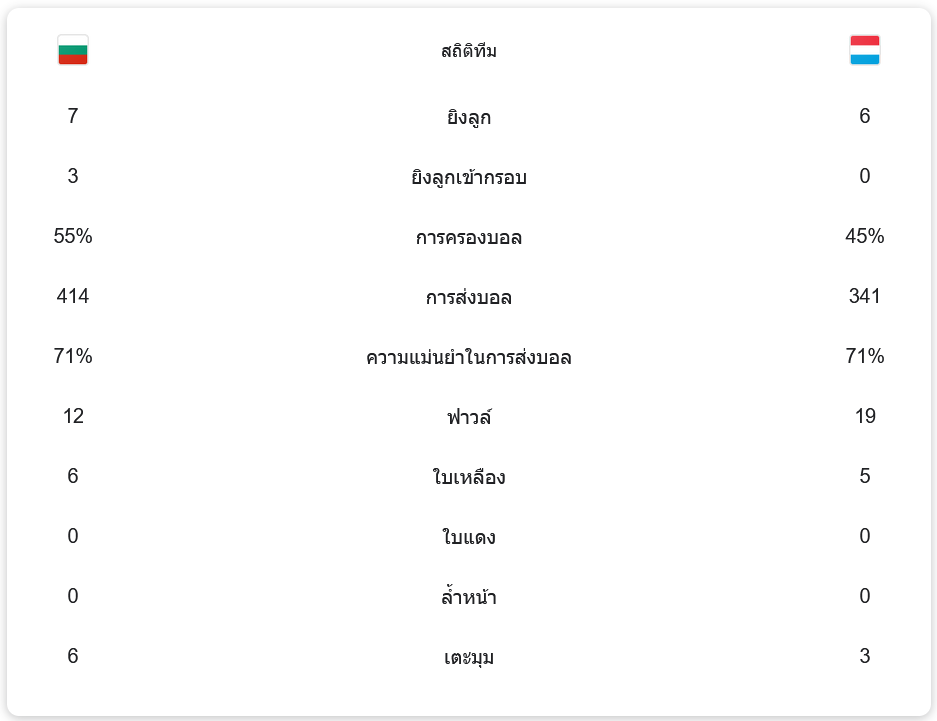บัลแกเรียมีการครองบอลได้มากกว่าที่ 55% พร้อมกับการยิงเข้ากรอบถึง 3 ครั้งจากทั้งหมด 7 ครั้ง ส่วนลักเซมเบิร์กแม้จะมีการครองบอลน้อยกว่าเพียง 45% แต่ก็สามารถสร้างความดุดันได้ในการตั้งรับ โดยทำฟาวล์ไปถึง 19 ครั้ง และได้รับใบเหลืองถึง 5 ใบ ขณะที่บัลแกเรียทำฟาวล์ 12 ครั้งและได้รับใบเหลือง 6 ใบเช่นกัน สถิติเหล่านี้แสดงให้เห็นถึงเกมที่เต็มไปด้วยการปะทะและแรงกดดันระหว่างทั้งสองฝ่าย