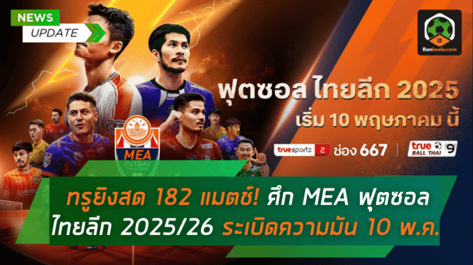 เตรียมระเบิดศึกโต๊ะเล็กระดับสูงสุดของเมืองไทยอีกครั้ง! กับรายการ MEA ฟุตซอลไทยลีก ฤดูกาล 2025/26 ที่เตรียมเปิดฉากฟาดแข้งอย่างยิ่งใหญ่ในวันเสาร์ที่ 10 พฤษภาคม 2568 โดยในฤดูกาลนี้ ทรูวิชั่นส์ ยังคงตอกย้ำความเป็นผู้นำด้านคอนเทนต์กีฬาระดับโลกด้วยการคว้าสิทธิ์ ถ่ายทอดสดครบทั้ง 182 แมตช์ แบบจัดเต็ม เอ็กซ์คลูซีฟทุกสนามผ่าน TrueVisions NOW แพลตฟอร์มสตรีมมิงที่ดีที่สุดของไทย