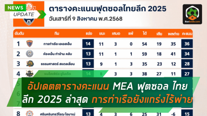การแข่งขัน MEA ฟุตซอล ไทยลีก 2025 เดินทางเข้าสู่ช่วงกลางฤดูกาลและกำลังเข้มข้นดุเดือดเต็มพิกัด แต่ละทีมต่างงัดฟอร์มเก่งเพื่อแย่งชิงพื้นที่หัวตาราง และเมื่ออัปเดตล่าสุดวันที่ 9 สิงหาคม 2568 บัลลังก์จ่าฝูงยังเป็นของ การท่าเรือ เอเอสเอ็ม ที่โชว์ฟอร์มสุดโหดไร้พ่ายตลอด 14 นัด เก็บไปถึง 36 คะแนนเต็ม ยิงกระหน่ำ 54 ประตู เสียเพียง 19 ลูก ผลต่างประตู +35 ยืนยันความแข็งแกร่งทั้งเกมรุกและเกมรับ